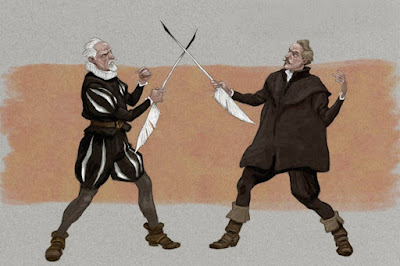 Amigos en un primer momento —según dicen—, Miguel de Cervantes (1547-1616) y Lope de Vega (1562-1635), genios de las letras españolas, acabaron declarándose la guerra. Sobre quién de los dos la inició hay discusiones. Cervantes admiraba el éxito de Lope como comediógrafo y su prolífica producción, por lo cual lo calificó de «fénix de los ingenios» y «monstruo de la naturaleza»; lo que no sabemos es si también se enrabietó porque no se representaban sus obras teatrales. Se dice que Lope se defendió de las críticas que Cervantes hizo de sus comedias en el Quijote, sin nombrarlo: refiriéndose a él como «felicísimo ingenio de estos reinos». También se dice que Lope no veía rival como dramaturgo, ni en general literario, hasta la publicación de El Quijote, y que el triunfo de su rival no lo pudo digerir. Sea como fuere, creemos que ambos en el fondo admiraban sus respectivas capacidades. Y ambos gigantes de la letras nos han inspirado un soneto dialogado.